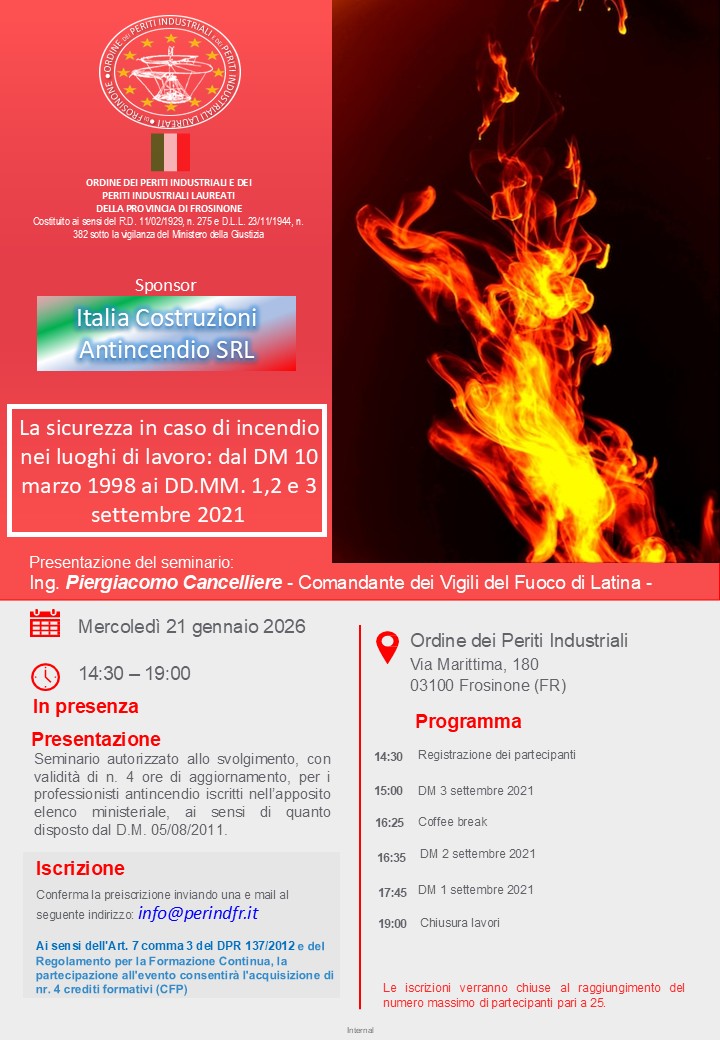 Seminario 21.01.2026 – La sicurezza in caso di incendio nei luoghi di lavoro: dal DM 10 marzo 1998 ai DD.MM. 1,2 e 3 settembre 2021